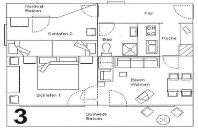 1 Wohnraum, 2 Schlafräume, Küche, Bad, 2 Balkone